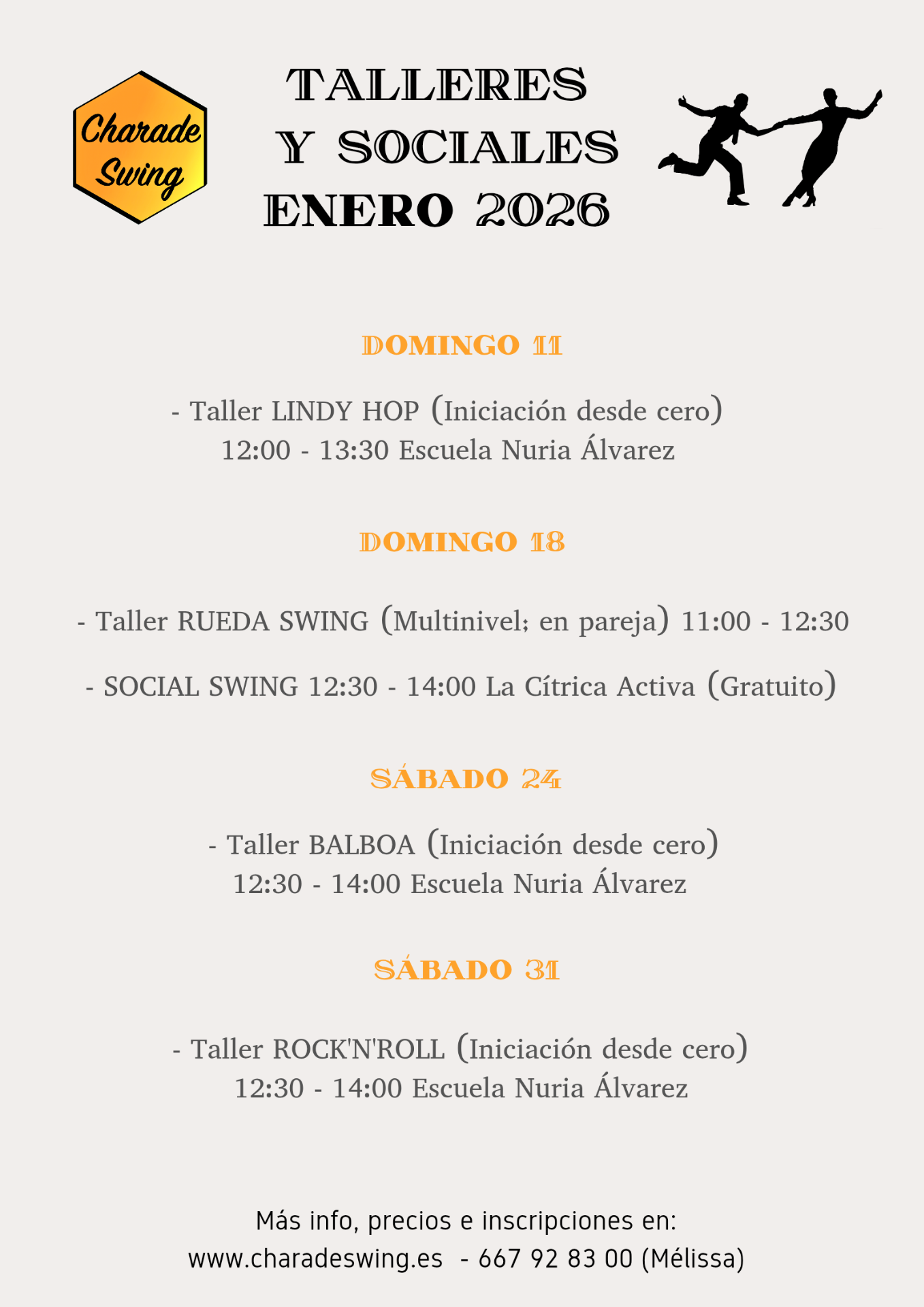 - Rock'n'Roll 0: Nivel iniciación. Descubre y aprende los básicos del rock'n'roll desde la base. Nunca has bailado o te apetece retomar desde de principio.